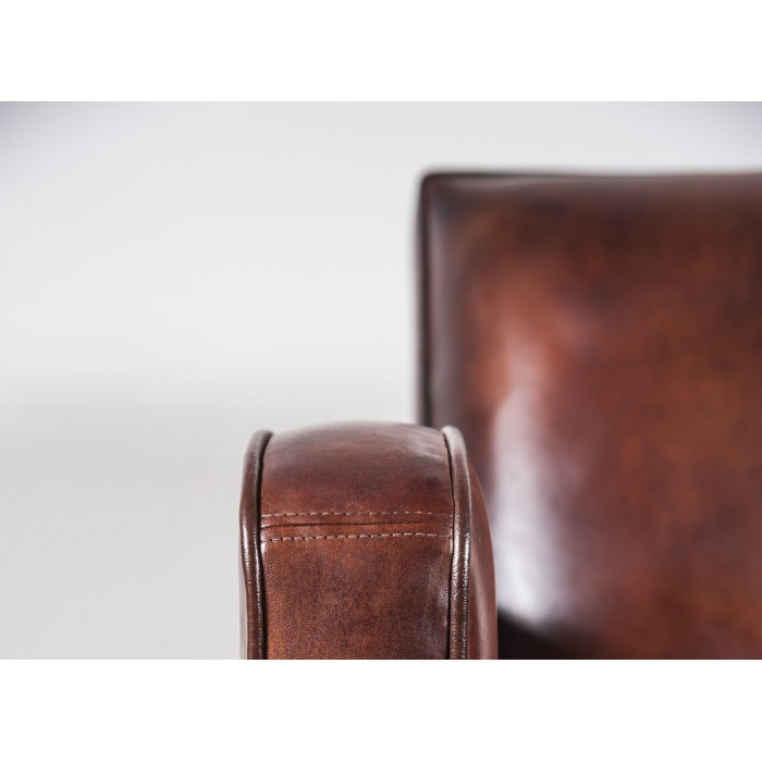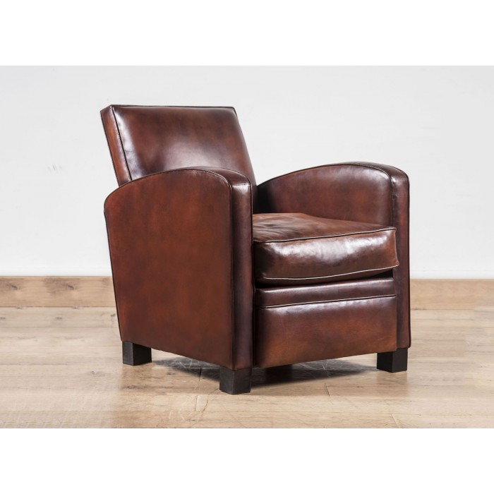 Fauteuil club en cuir de basane aux lignes modernes épurées et élégantes. Ce fauteuil club est réalisé dans la plus pure tradition artisanale. Nous vous proposons une fabrication soignée, en peau de mouton patinée à l’ancienne.